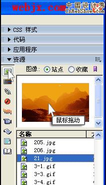 (3)使用面板组“资源”面板(如下图):点按钮,展开根目录的图片文件夹,选定该文件,用鼠标拖动至工作区合适位置