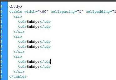 4.第四步 ? 成功插入表格后,在html代码中就会自动生成代码。其中注意到两个参数,cellspacing控制边框像素,cellpadding控制内容到边框的距离