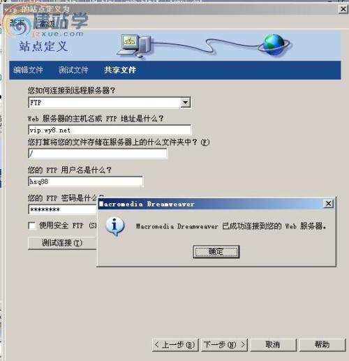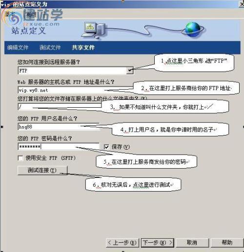 第五步:按提示连接用FTP、并打上由服务商给你的FTP地址,用户名和密码,并进行测试。