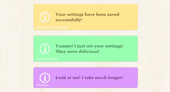这款提示框动画在出现和消失的时候可以有淡入淡出的动画特效,并且提示框内置一个进度条,走完进度条时提示框即可消失。