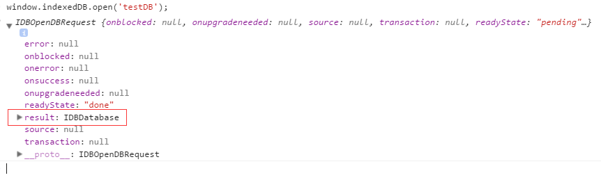 在IndexedDB大部分操作并不是我们常用的调用方法,返回结果的模式,而是请求——响应的模式,比如打开数据库的操作