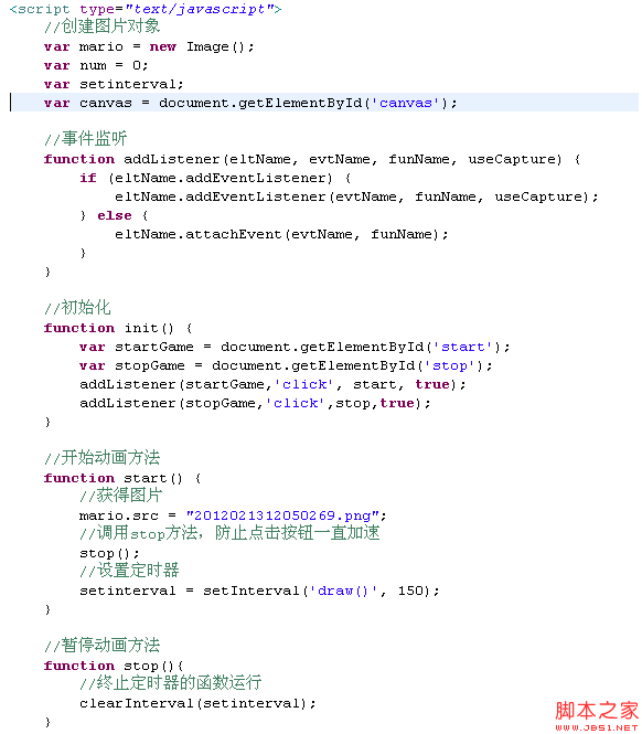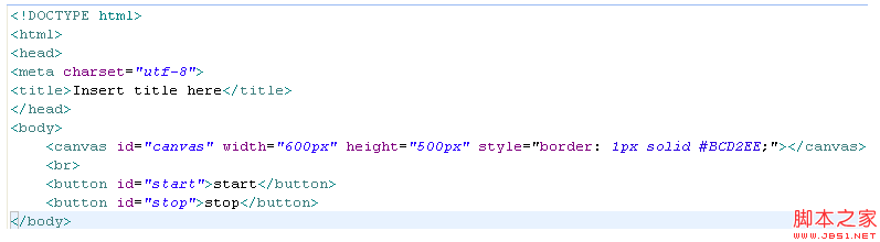 2.新建一个html5文件,此处命名为mario.html,定义canvas元素,开始动画start按钮,暂停动画stop按钮