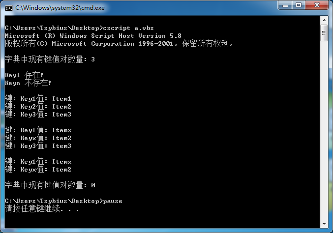 wscript.echo "字典中现有键值对数量: " & dict.count '让一个脚本在屏幕上显示文本信息
