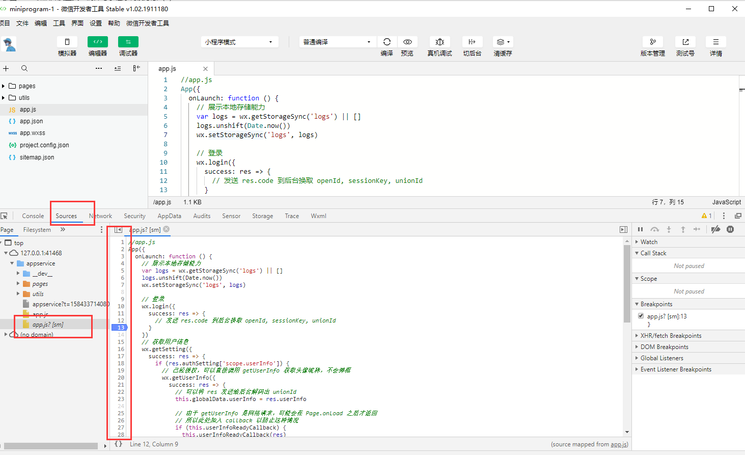 2、断点调试,在控制台sources点击对应文件,左侧可以进行打断点操作