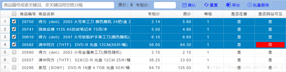 | 商品编号 | 商品名称 | 专柜价 | 原价 | 等级 | 是否在售 | 是否网站可见 |