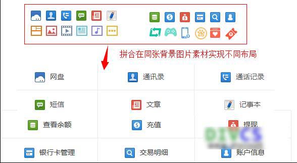 首先这些图标素材是放在同一张图片上(ps拼合),然后实现成列表类布局,列表每个前图标不同。使用css sprites实现此布局(其实使用background样式实现)。