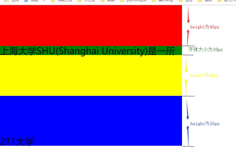 结论:可以看出,黄色背景div和蓝色背景div的height加起来就是类名为bg0的div的所设置的line-height=100px,而第一部分红色div设置的height=45px,是line-height减去fontsize后在除以2得到的,即(100-10)/2=45px。