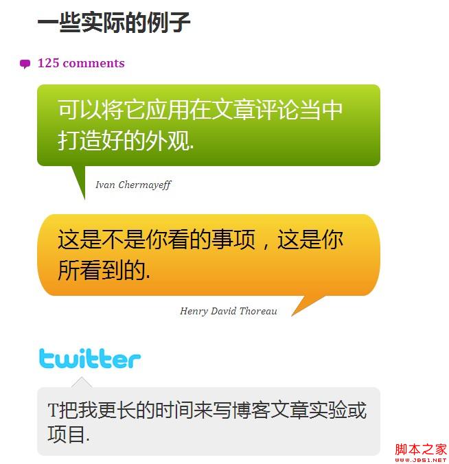 语音气泡是一种很流行的效果,在很多社交网站上可以看到评论使用这样的效果来实现,对于游客来说非常有吸引力,但我发现很多这样的效果都是依赖于html或javascript来实现的非常麻烦。本教程包含各种形式的使用css 2.1与css3创建的渐进增强气泡效果。纯css3打造,没有使用图像,没有javascript,它可以应用到您现有的html当中。