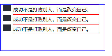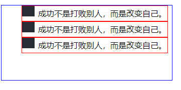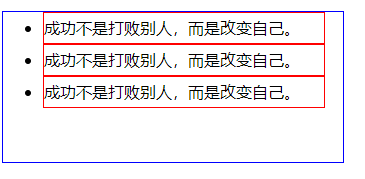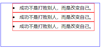 list-style-position属性值为outside之前,我们先看看列表前面的项目符号的默认位置在哪,笔者为了让初学者有一个直观的印象,笔者将html页面中的ul标签li标签设置了一些样式。 ul标签样式如::width宽度设置为300px像素、height高度为150px像素、border边框为(1px像素、显示是实线、边框颜色为蓝色)、样式。ul标签中的li标签设置样式如:width宽度设置为280px像素、height高度为30px像素line-height行高为30px像素、border边框为(1px像素、显示是实线、边框颜色为红色)、样式。如果园友没有掌握