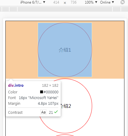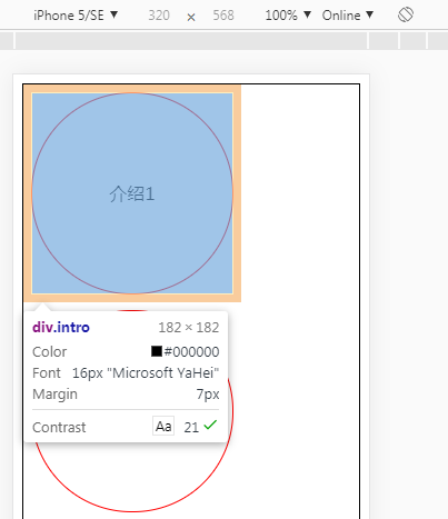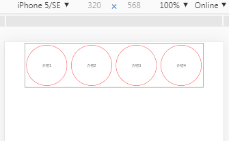 可以看到添加meta标签后会自动根据设备的宽度进行适配,iphone 5 的宽度为 320px,圆圈的宽度为 182px, margin-left 为 7px,再加上右边还有 7px 的 margin-right,所以加起来一共占了 196px,所以还剩下 124px,所以第二个圆圈只能排在第二行。