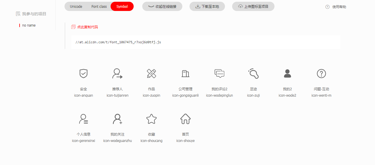 使用它的方法也非常简单,我们首先需要引入上面的就js,这个js是阿里巴巴专门为你的项目生成的,每一个项目的地址都不一样,而且包括这个项目里图标变动也会影响地址需要更新,所以一旦确定使用之后尽量避免更改,之后我们在复制一段css放到页面上