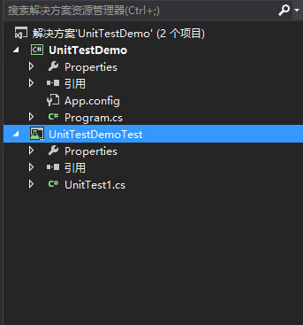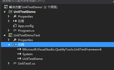 5.在单元测试项目中引用控制台项目,引用完毕后项目结构如下: