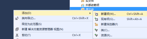 然后右边点选 源文件 右键,添加,新建项,然后点 C++文件,添加。完成,之后就可以写了。