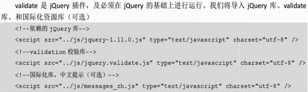 (2)既然是一个插件,使用之前就需要先导入文件validate库,当然同时也需要导入jQuery库,另外,也可导入支持中文的国际化资源库,如下:
