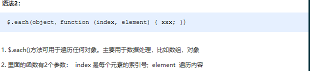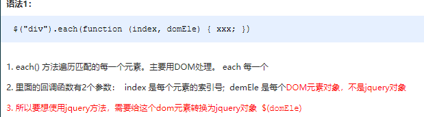 ? 注意:此方法用于遍历 jquery 对象中的每一项,回调函数中元素为 dom 对象,想要使用 jquery 方法需要转换。