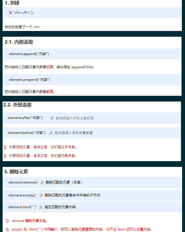 jquery方法操作元素的创建、添加、删除方法很多,则重点使用部分,如下: