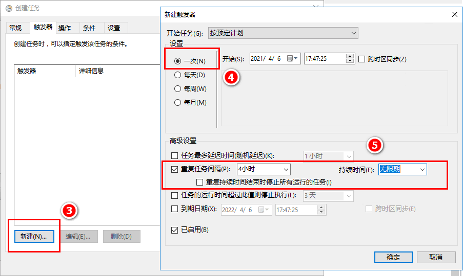 - 在触发器高级设置中选择重复任务间隔根据需要设置,持续时间设置为无限期。这样配置的结果就是在触发后,无限期地每隔xx时间段重复一次