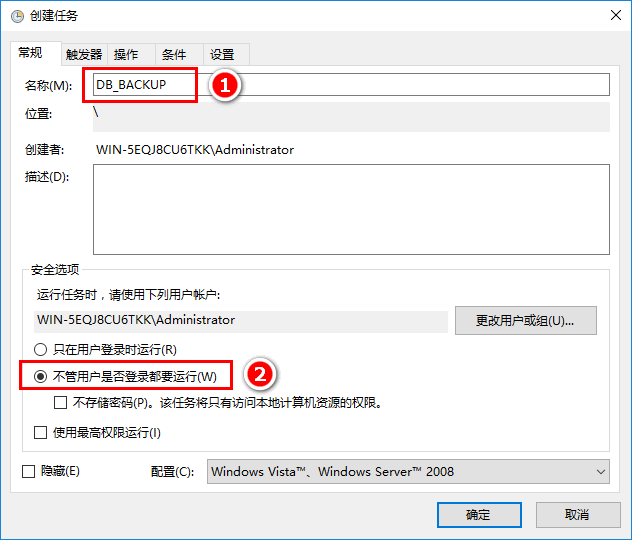 - 如果是服务器环境,安全选项中务必选择不管用户是否登录都要运行