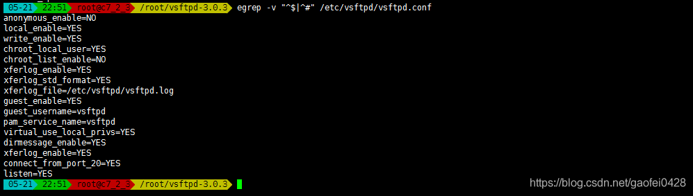 anonymous_enable=no local_enable=yes write_enable=yes #不启动锁定用户名单,所有的用户都将被锁定不允许访问上级目录,只允许访问其主目录 chroot_local_user=yes chroot_list_enable=no #启动log xferlog_enable=yes xferlog_std_format=yes xferlog_file=/etc/vsftpd/vsftpd.log #开启虚拟用户 guest_enable=yes #ftp虚拟用户对应的系统用户 guest_username=vsftpd #pam认证文件/etc/pam.d/vsftpd pam_service_name=vsftpd virtual_use_local_privs=yes