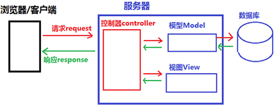 - 用户通过浏览器向服务器发起 request 请求,controller 层接受请求后,同时向 model 层和 view 发送指令;