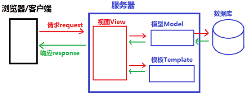 - 用户通过浏览器对服务器发起 request 请求,服务器接收请求后,通过 view 的业务逻辑层进行分析,同时向 model 层和template 层发送指令;