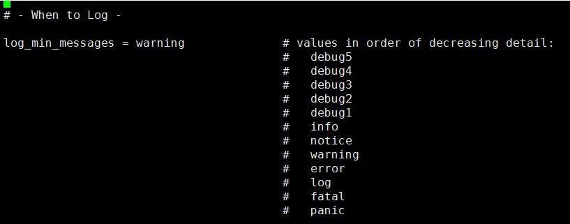 首先我们先从日志的详细度来入手,log_min_messages 定义了日志的详细程度,其实我们在选择上可能会有一些纠结,纠结点在error warning notice 这三种,大部分人可能在选择error ,出错就报错误,warning 也有相关选择,实际上选择不同的日志的详细度也是有相关的一些考虑