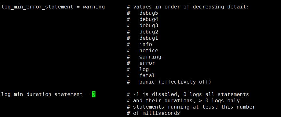 log_min_duration_statement 是对应慢查询的日志,当设置的值大于0 后,则超过对应设置数字秒数的sql 语句将被记录。