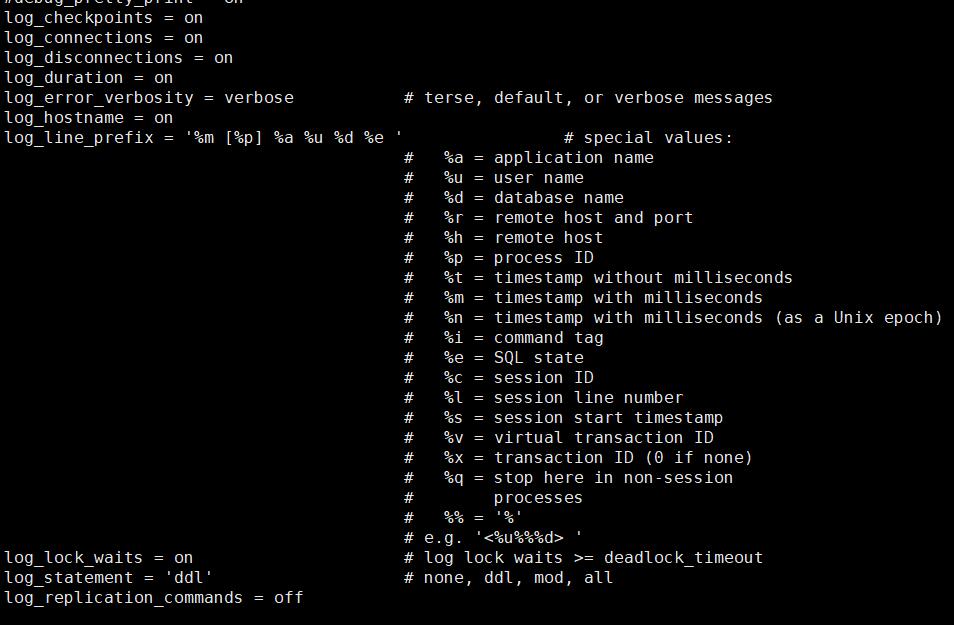 6 log_line_prefix 相当于对日志的打印的格式和信息的设置,有些监控系统对此是有要求的,请按照你安装的监控系统的要求配置此栏