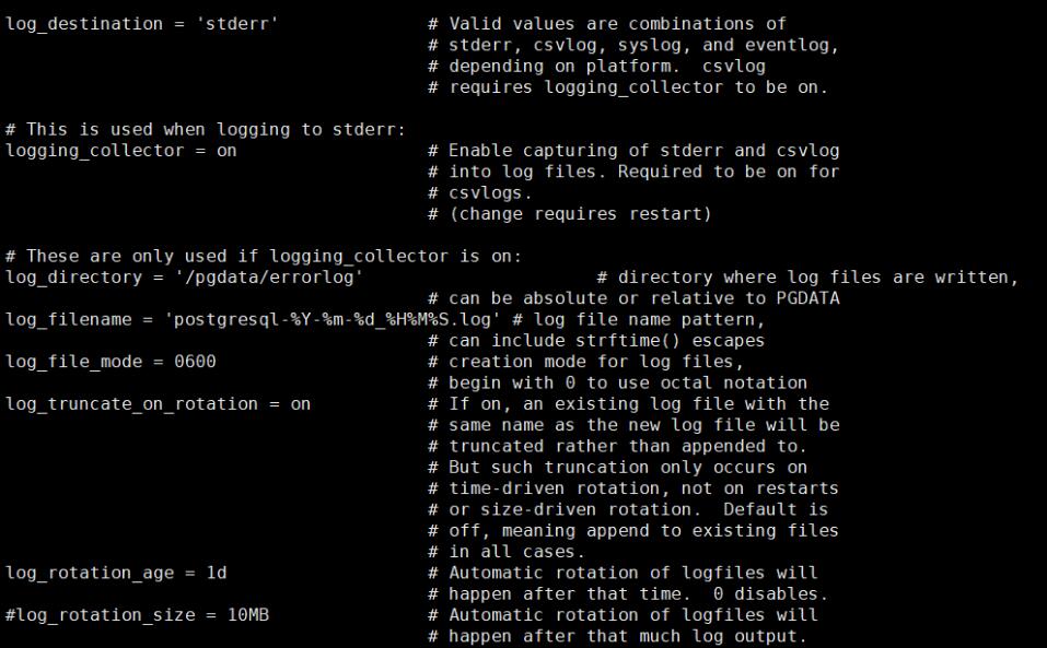 #log_destination = 'stderr' #日志格式,值为stderr, csvlog, syslog, and eventlog之一. logging_collector = on #启用日志 #log_directory = 'log' #日志文件存储目录 #log_filename = 'postgresql-%y-%m-%d_%h%m%s.log' #日志文件命名方,默认为每秒一个文件(postgresql-2017-10-18_231548.log) #log_file_mode = 0600 #日志文件权限 #log_truncate_on_rotation = off #是否截断日志文件