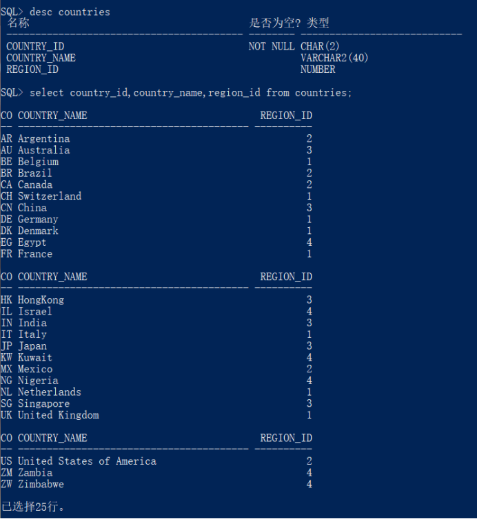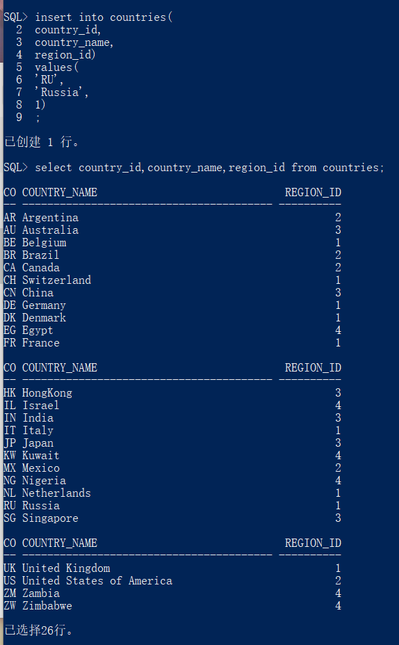 2.手动为COUNTRIES表添加一些数据,例如(RU,Russia,1)。