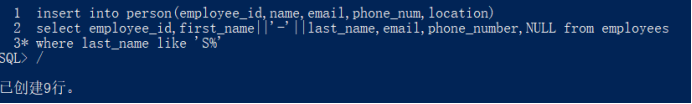 3.新建表PERSON(EMPLOYEE_ID,NAME,EMAIL,PHONE_NUM,LOCATION),表中数据从表EMPLOYEES中提取,条件是LAST_NAME以S开头,NAME为FIRST_NAME与LAST_NAME的合并,LOCATION列以NULL填充。