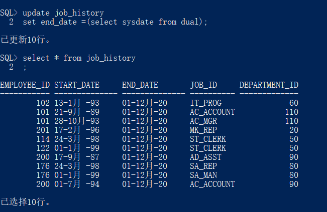 4.将表JOB_HISTORY中的END_DATE列的值均改为今天。