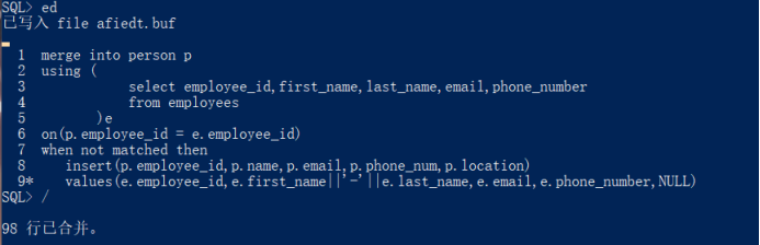 6.用MERGE命令,将EMPLOYEES表中剩余的员工补充到表PERSON中。