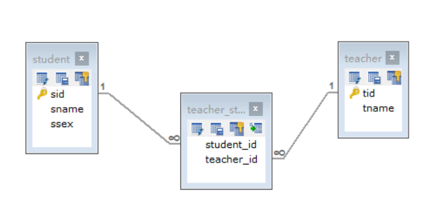 异:两表之间需要一个中间表来连接两表(中间表至少需要两个外键列)