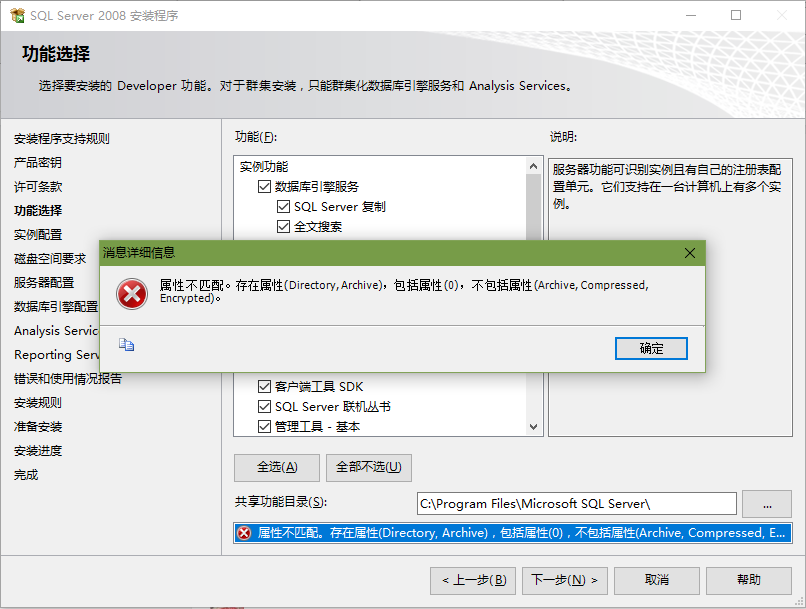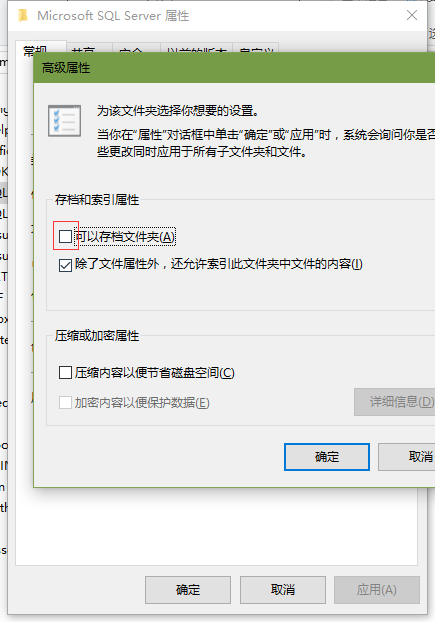 解决:确保c盘以及其子文件夹c:\program files\microsoft sql server和c:\program files (x86)\microsoft sql server的高级属性没有勾选 可以存档文件夹