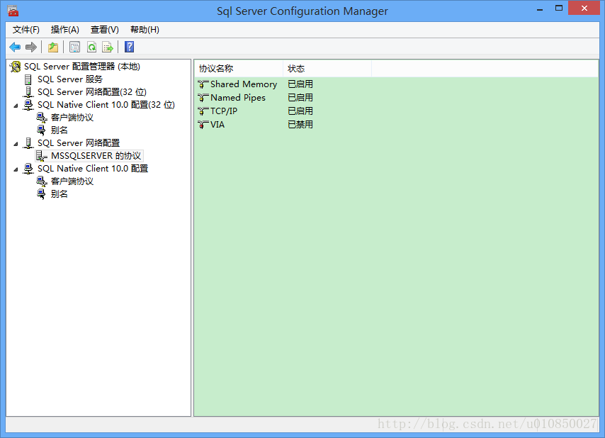 解决:第一步,程序--sql server2008--配置工具--sql server配置管理器,找到sql server网络配置中的mssqlserver的协议:启用如下协议。