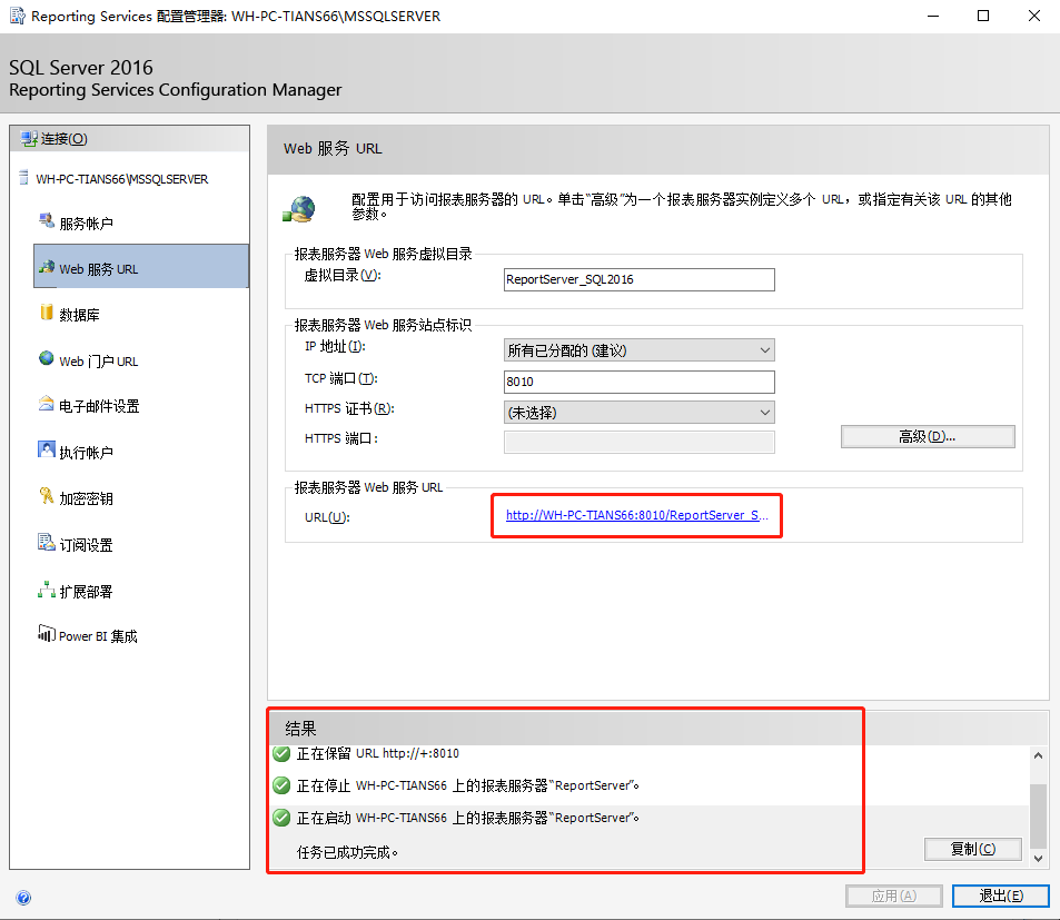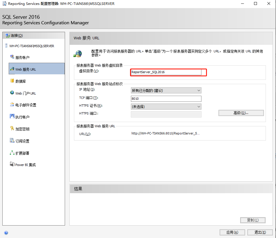 3.设置web服务url,填写虚拟目录,这将会是访问报表的路径。设置ip地址选择所有已分配的(建议),端口号填非80,点击应用。