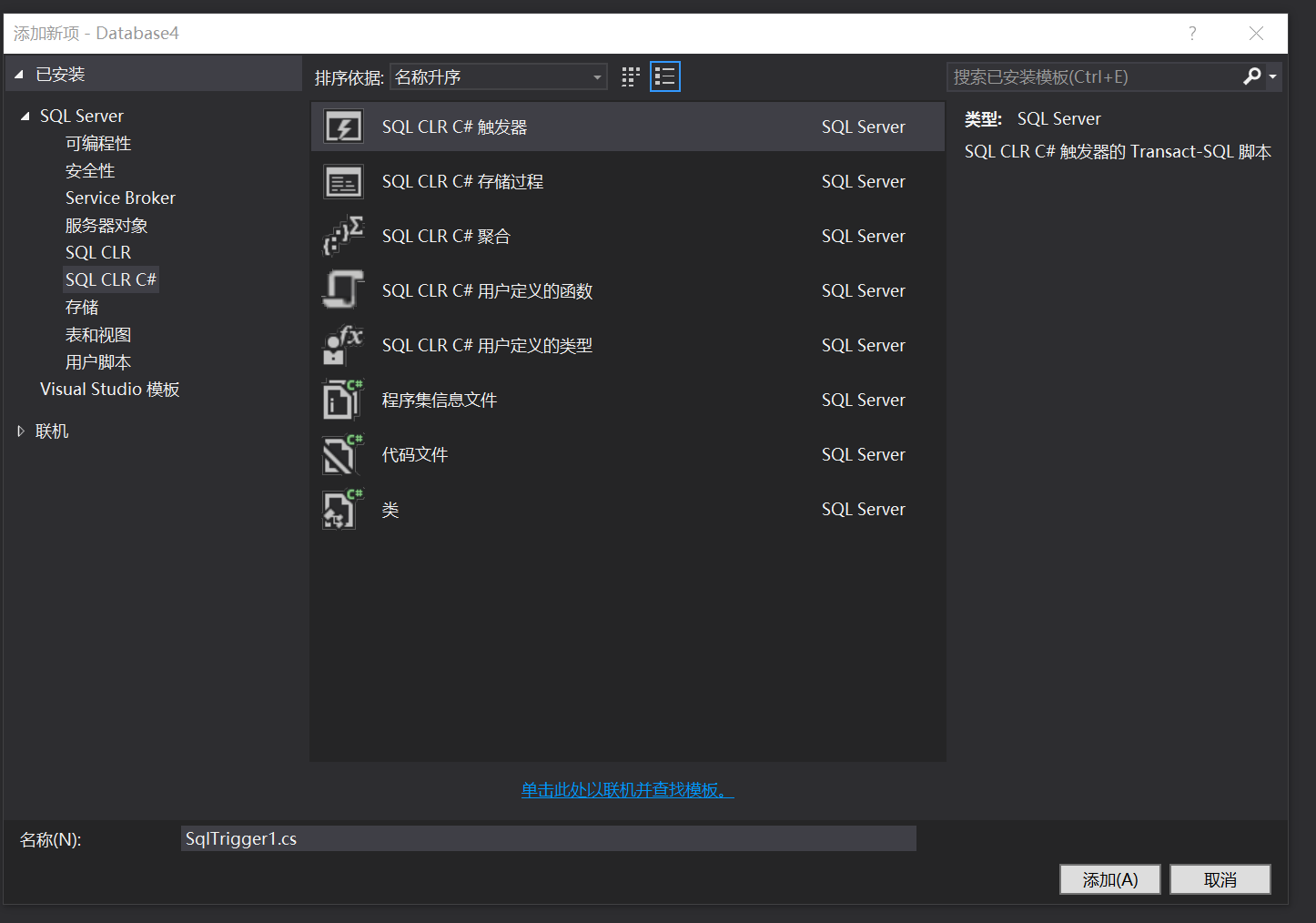 但是在vs 2015里,只有先创建数据库对象,然后添加sql clr c#类型的item了: