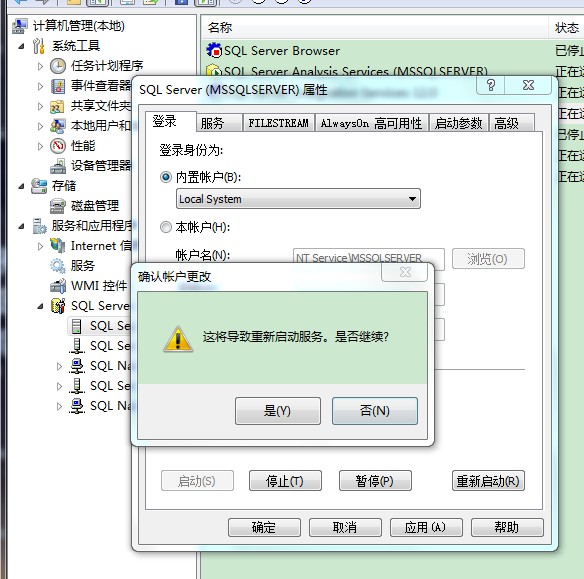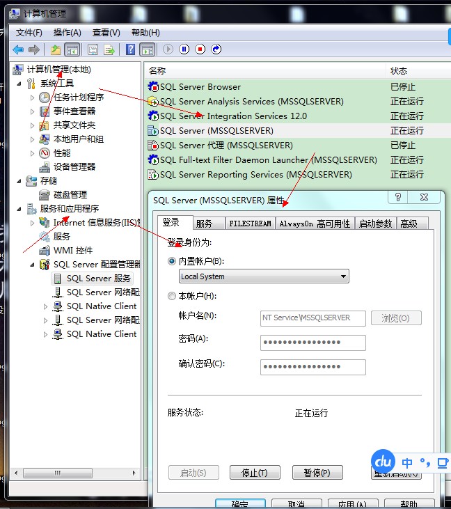 我的电脑-右击-管理-服务和应用程序--sql server 服务,选择对应自己的实例名的--右击属性-登录