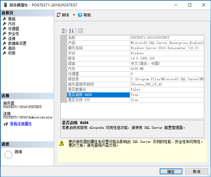 检查,如果 alwayson 启用成功,在服务器属性里可以看到启用hadr为true
