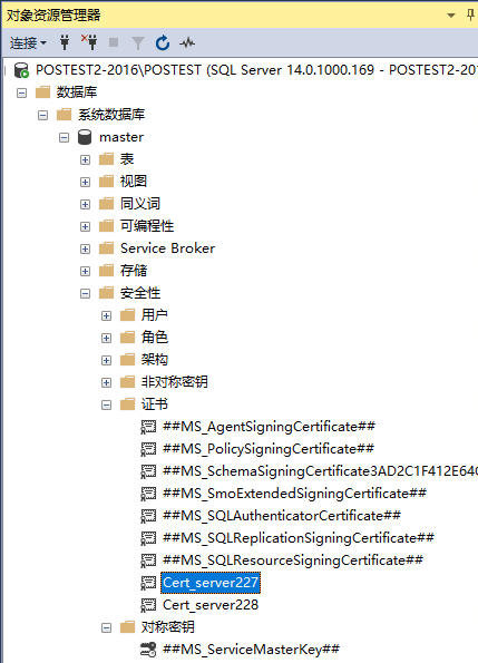 --节点二:创建主密钥/证书,备份证书。 use master; go create master key encryption by password = 'aaa111aaa'; go create certificate cert_server228 with subject = 'cert_server228', start_date = '2017-01-01',expiry_date = '2099-12-30'; go backup certificate cert_server228 to file = 'c:\storage\cert_server228.cer'; go