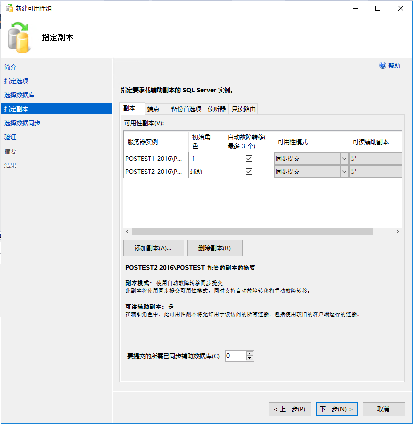 添加副本节点,并勾选自动故障转移,设置辅助副本为可读副本