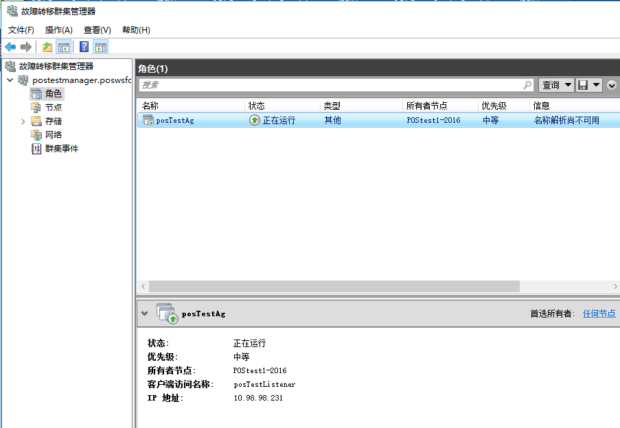 创建成功后,在故障转移集群管理器里的角色节点,可以看到客户端访问名称和 ip 地址