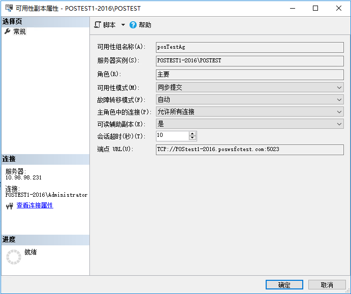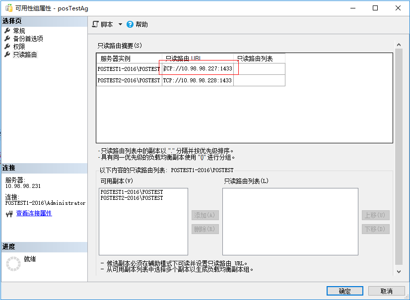 use [master] go alter availability group [postestag] modify replica on n'postest1-2016\postest' with (secondary_role(read_only_routing_url = n'tcp://10.98.98.227:1433')) go alter availability group [postestag] modify replica on n'postest2-2016\postest' with (secondary_role(read_only_routing_url = n'tcp://10.98.98.228:1433')) go