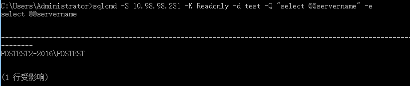 sqlcmd -s 10.98.98.231 -k readonly -d test -q "select @@servername" -e
