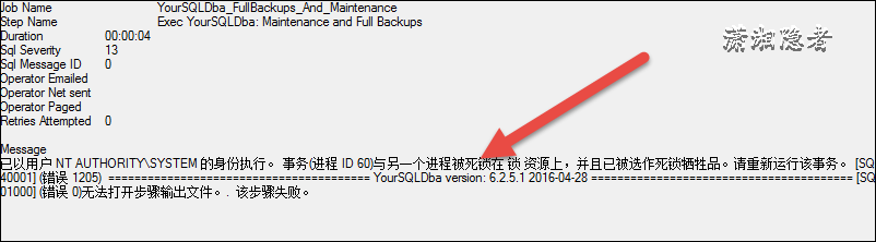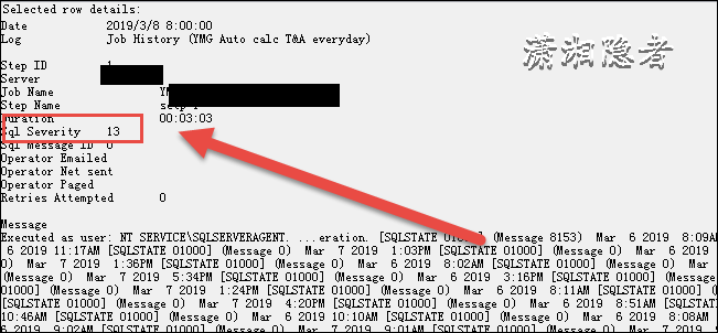 如上截图所示,从这里可以看到出错信息的sql severity级别为13, 通过数据库引擎错误严重性(database engine error severities),我们可以知道13意味着indicates transaction deadlock errors. 也就是说出现死锁,导致作业的会话成为了死锁的牺牲品。不过也很奇怪,以前也遇到过作业由于出现死锁,导致作业失败的情况。都会在message里面有提示,但是这个实例的版本sql server 2012 sp3(11.0.6020.0),出现死锁,居然没有提示相关死锁信息。不清楚是bug还是其它原因。