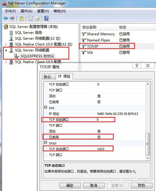 从sql server网络配置→sqlexpress的协议,双击打开tcp/ip,选择ip地址,设置需要访问的ip地址(例如172.24.178.101),然后将tcp动态端口设置为空(空表示不启用动态端口,0表示为使用动态端口),最下端有个ipall设置,需要把端口设置为1433。