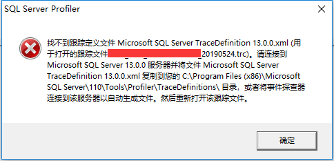 找不到跟踪定义文件microsoft sql server tracedefinition 13.0.0.xml(用于打开的跟踪文件x.trc)。请连接到microsoft sql server 13.0.0服务器并将文件microsoft sql server tracedefinition 13.0.0.xml复制到您的c:\program files (x86)\microsoft sql server\110\tools\profiler\tracedefinitions目录,或者将事件探查器连接到该服务器以自动生成文件。然后重新打开该跟踪文件。