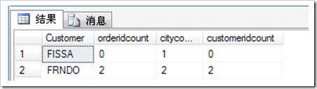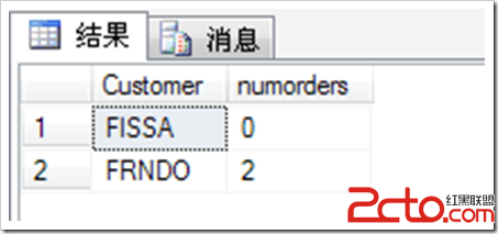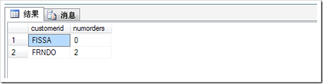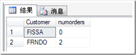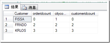 同样是很简单的一个查询,它返回是订单总数小于3的客户。如下所示