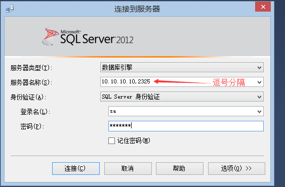 方法一:客户端数据库直接测试 这里需要注意的是 数据库服务器格式 : ip地址,端口号 (ip地址和端口号之间使用的 ',' 号分隔)